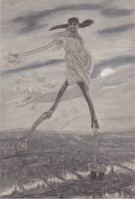 Seul le fantastique sauve Kubin de ce destin. Il se réfugie dans ce monde, si terrible, glacial, tourmenté soit-il pour échapper à cette violence. Celle de son père le frappant avec un bâton. Eros et Thanatos sont partout dans son oeuvre. Eros, représenté par ces serpents, symboles phalliques, qui finissent par vous étouffer. Le pauvre petit humain, n'a pour option, durant son rapide parcours sur terre, que d'être confronté à la peur, la violence, les catastrophes, l'isolement, l'enfermement, la maladie qui le conduisent inéluctablement à un funeste destin. Tout n'est qu'histoire de domination et de pouvoir.