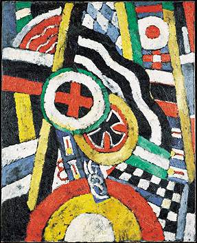 Ce tableau, exécuté en Novembre 1914, montre l'assimilation par Hartley à la fois du cubisme (les juxtapositions à la façon collage de fragments colorés) et l'expressionnisme allemand (le coup de pinceau grossier et l'utilisation dramatique des couleurs vives et noires).